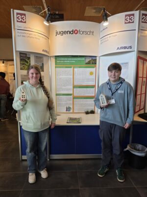 Lars Weertz und Emily Büsing (E-Phase) beschäftigten sich im Fachgebiet „Geo- und Raumwissenschaften“ mit der Frage, wie sich unterschiedliche Baumaterialien auf den urbanen Raum auswirken. Dabei untersuchten sie insbesondere den Temperaturanstieg verschiedener Materialien und wurden für ihre Ergebnisse mit dem 3. Platz ausgezeichnet.