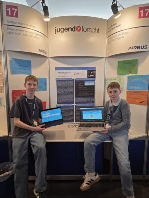 Henri Wehmeier und Paul Richter (Klasse 6c) stellten im Fachgebiet „Mathematik/Informatik“ ihr selbst programmiertes Jump-and-Run-Spiel vor. Dieses verbindet spielerische Elemente mit kleinen Informatikübungen und ermöglicht so einen motivierenden Einstieg in die Welt der Programmierung. Für ihre innovative Idee wurden sie mit dem 3. Platz ausgezeichnet.